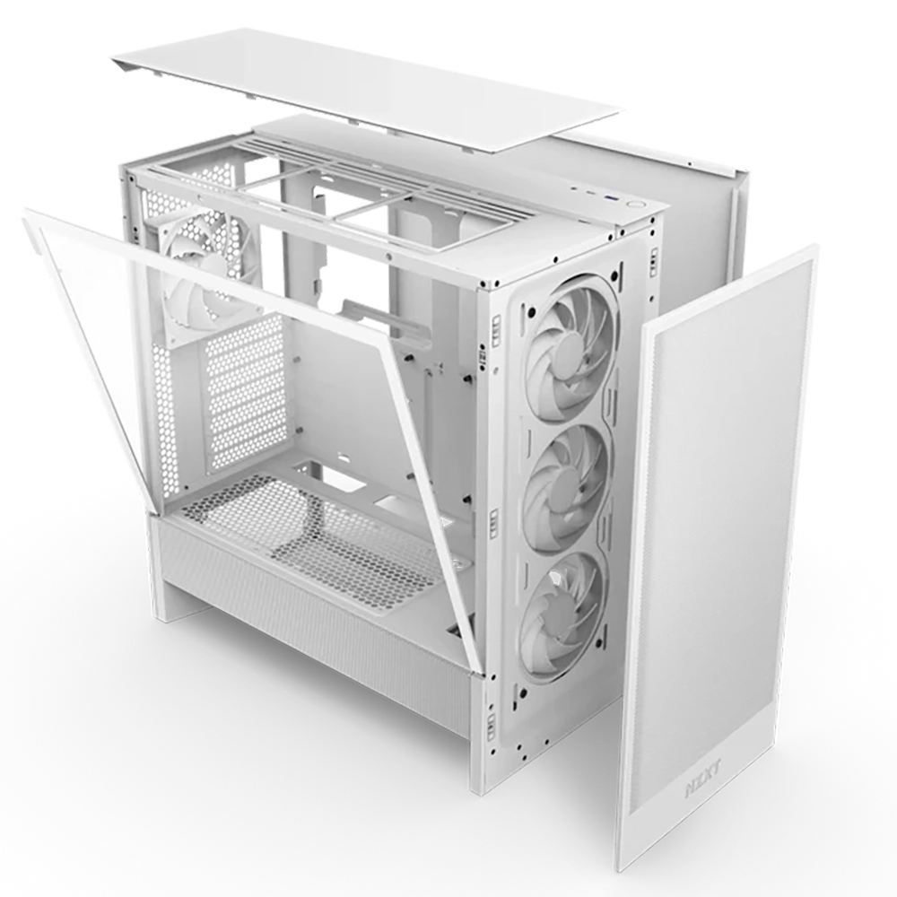 El NZXT H5 Flow RGB White (CC-H52FW-R1) es un gabinete mid-tower diseñado para sistemas gaming y de alto rendimiento con excelente flujo de aire y estética moderna. Su panel frontal de malla ultrafina y panel lateral de vidrio templado permiten una entrada de aire eficiente y una vista clara del interior del sistema, ideal para setups con iluminación RGB integrada.