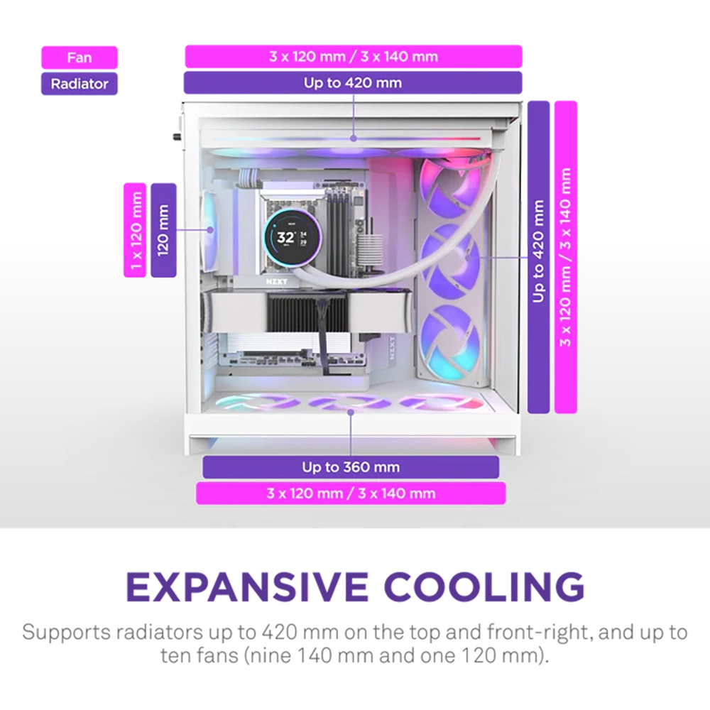 El NZXT H9 Flow RGB White (CM-H92FW-P1) es un gabinete mid-tower diseñado para ofrecer alto rendimiento térmico y estética moderna, ideal para builds gaming o estaciones de trabajo exigentes. Su diseño con panel frontal de malla y lateral de vidrio templado crea un flujo de aire eficiente y permite mostrar tus componentes con estilo.