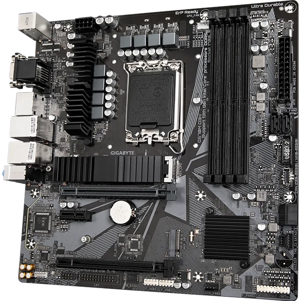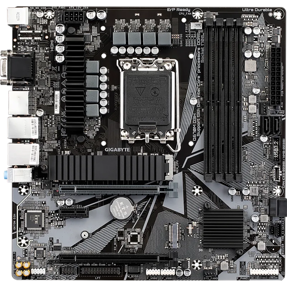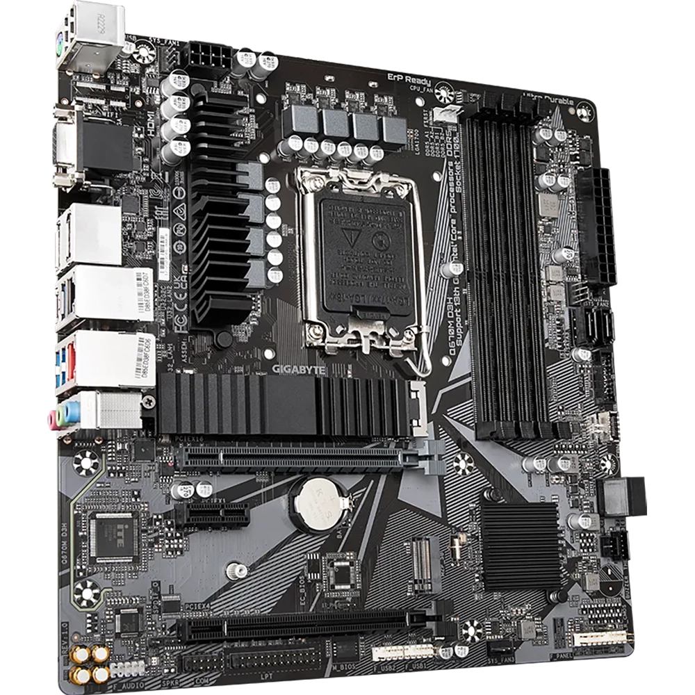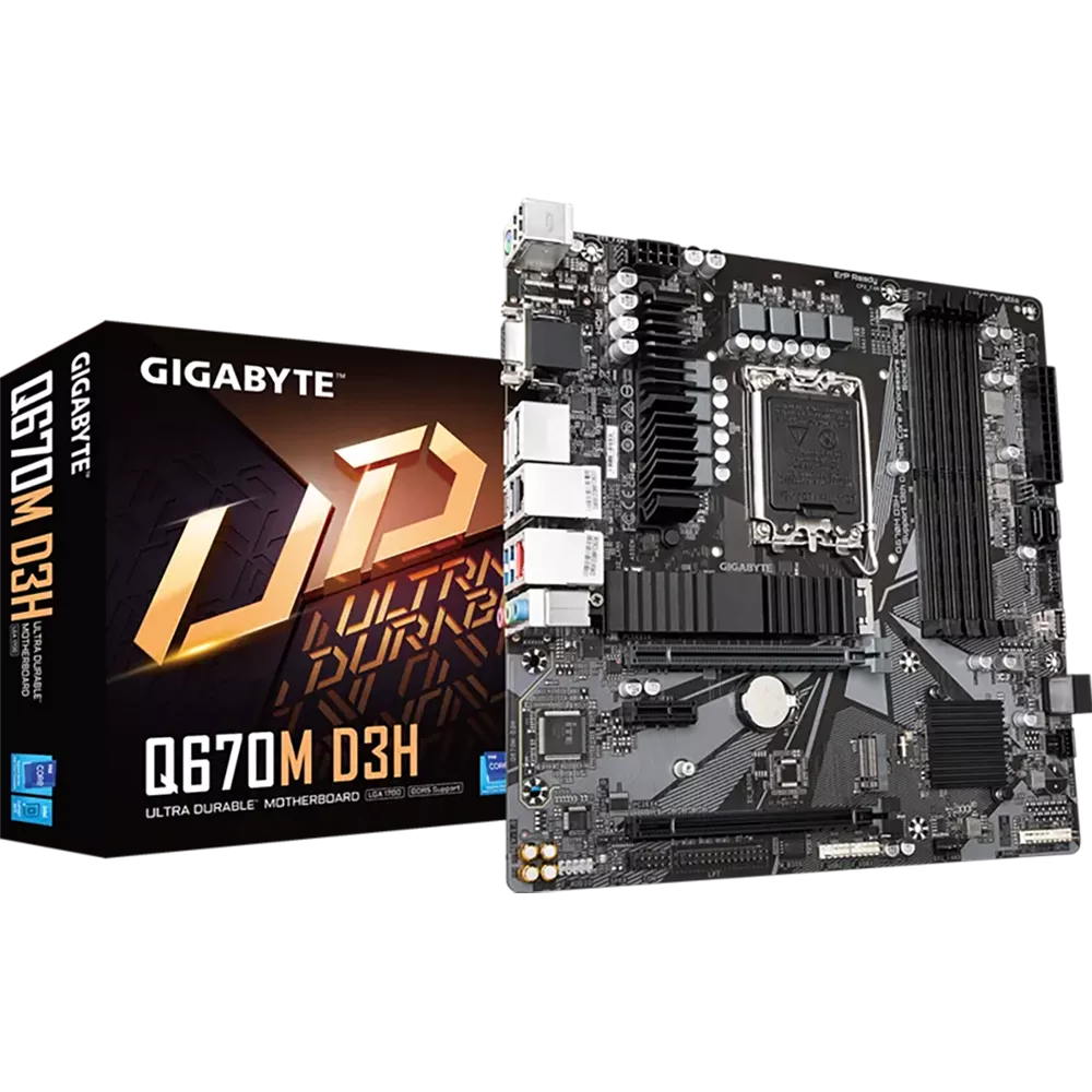 La Gigabyte Q670M D3H es una placa base Micro-ATX robusta y versátil con socket LGA1700 y chipset Intel Q670, ideal para construir PCs con procesadores Intel Core de 12ª, 13ª y 14ª generación, así como Pentium y Celeron compatibles.