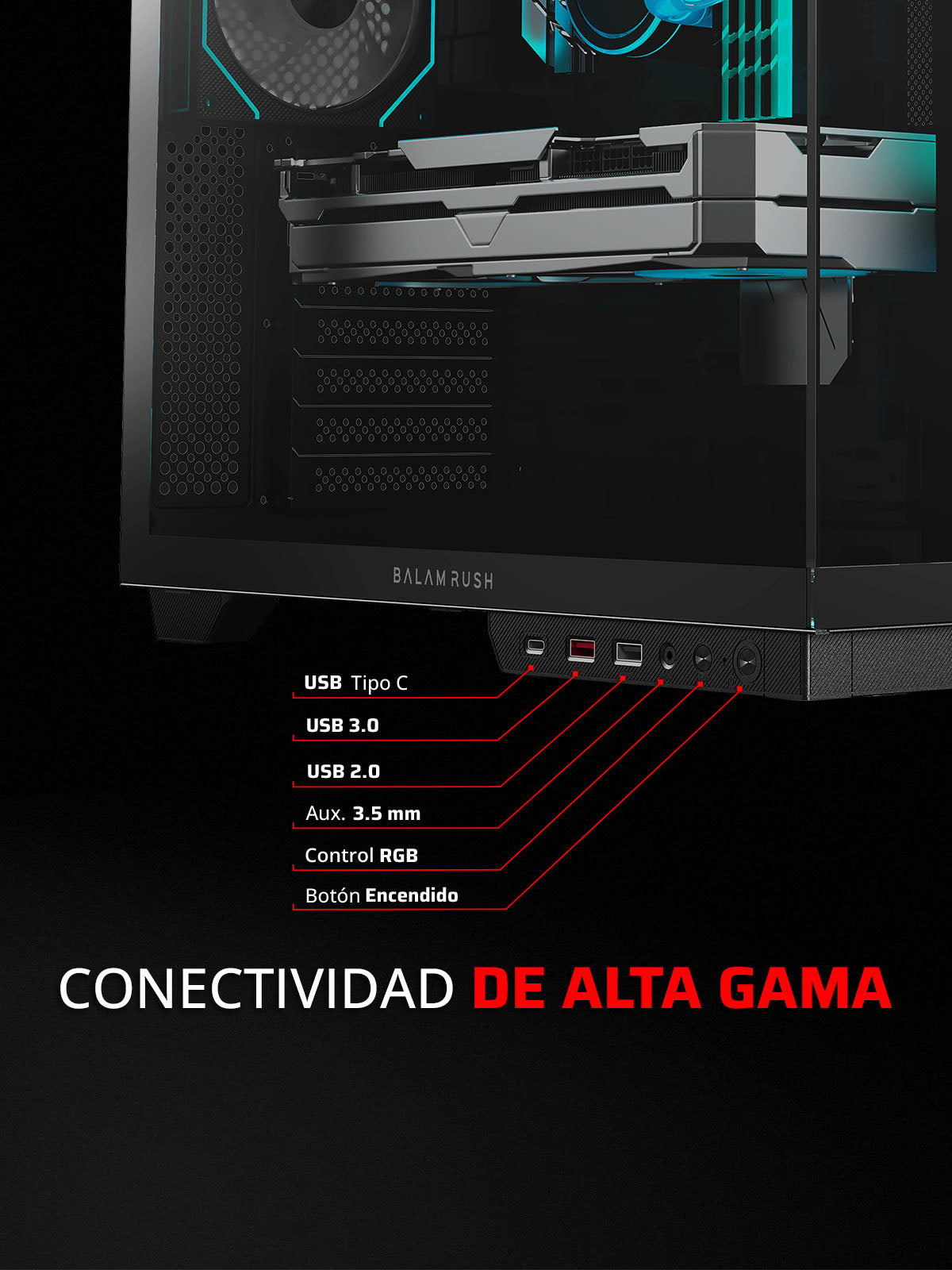 Diseñado para builds exigentes. Soporta tarjetas madre ATX y GPUs de hasta 380 mm, ofreciendo amplio espacio para componentes de alto rendimiento. Viene con 5 ventiladores preinstalados para un flujo de aire eficiente y constante. Su panel frontal incluye puertos USB-C 3.1, USB 3.0, USB 2.0 y audio, listos para tus periféricos favoritos. Los paneles de cristal aportan un acabado premium ideal para setups con iluminación RGB.