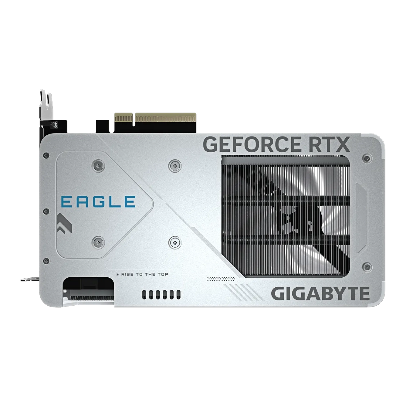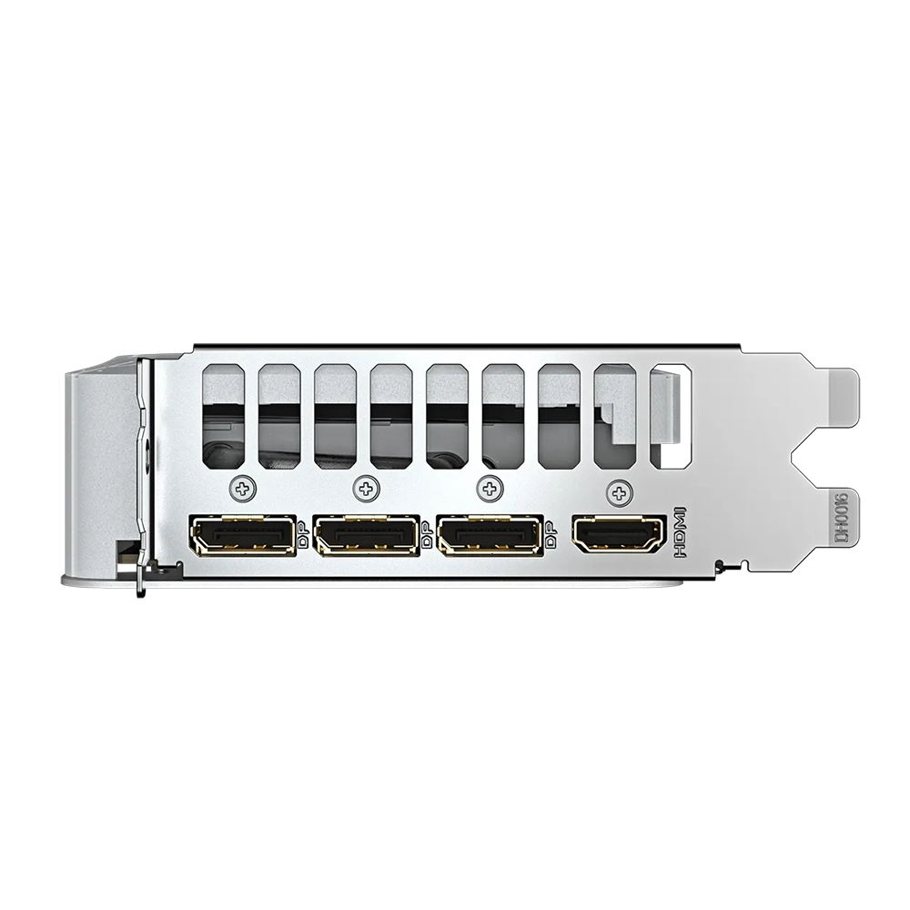 El sistema de refrigeración Windforce se compone de tres ventiladores de 80 mm con giro alterno que maximizan la presión estática sobre el radiador. El diseño incluye un backplate de protección metálico en color blanco con tecnología Screen Cooling, que permite el flujo de aire directo hacia la parte superior del gabinete, mejorando la circulación térmica interna.