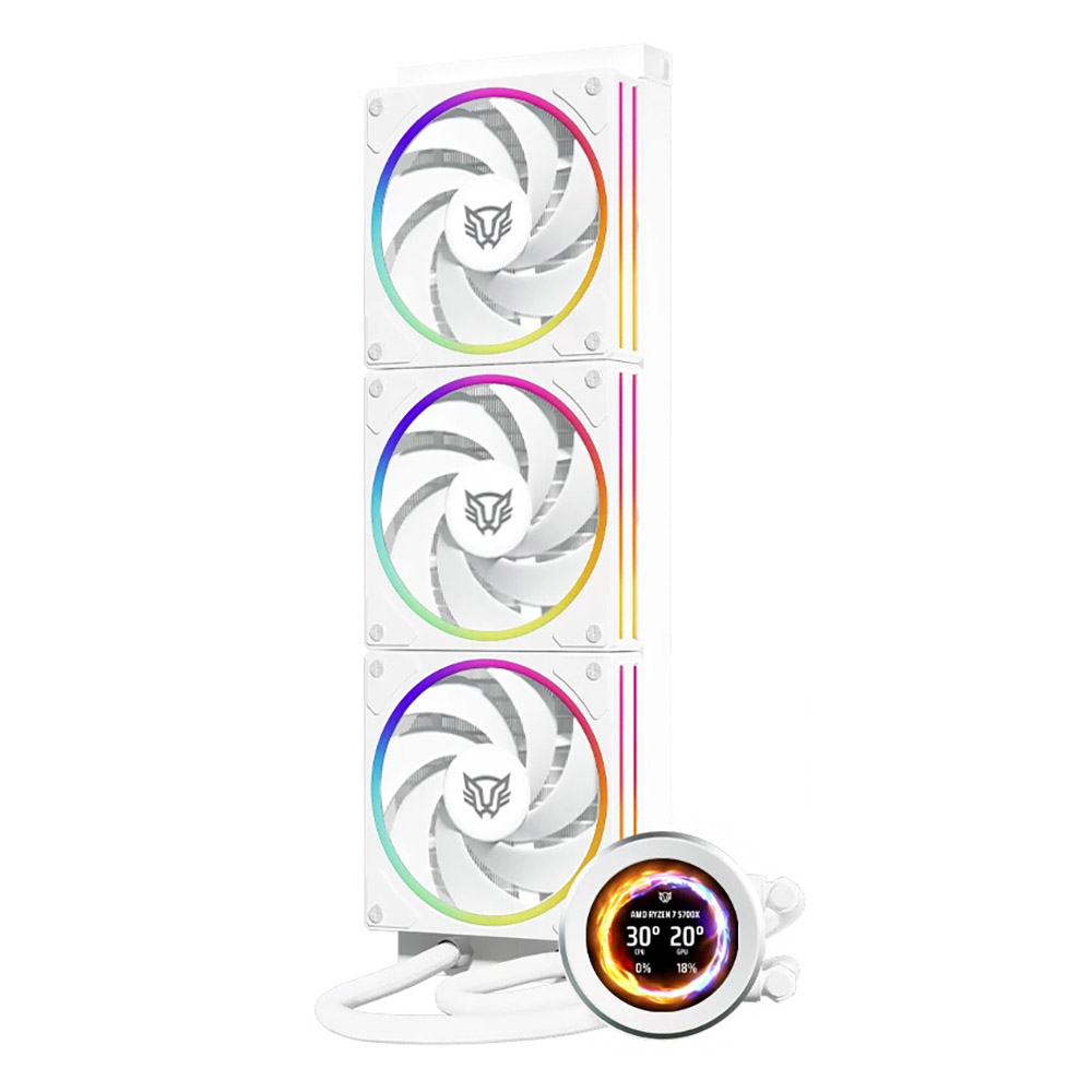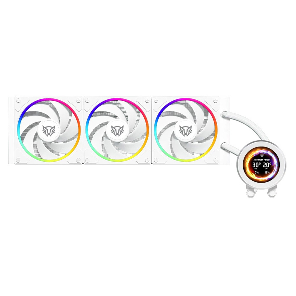 Cuenta con un radiador de 360 mm acompañado de tres ventiladores de 120 mm con rodamientos hidrodinámicos, capaces de operar entre 600 y 2200 RPM, proporcionando un flujo de aire eficiente y estable.